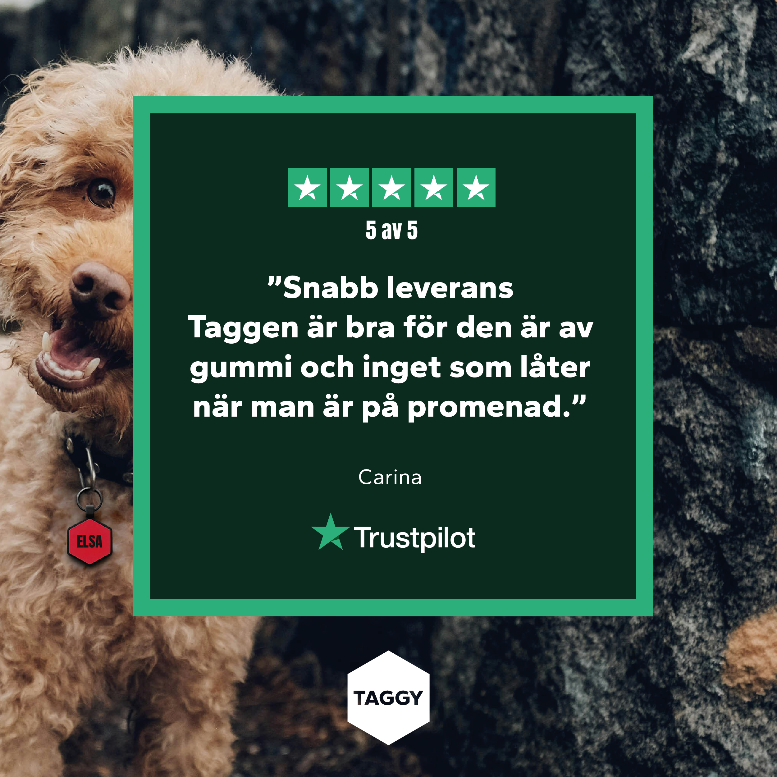 Hållbara namnbrickor för hund – Tysta, skrammelfria & lasergraverade | Taggy