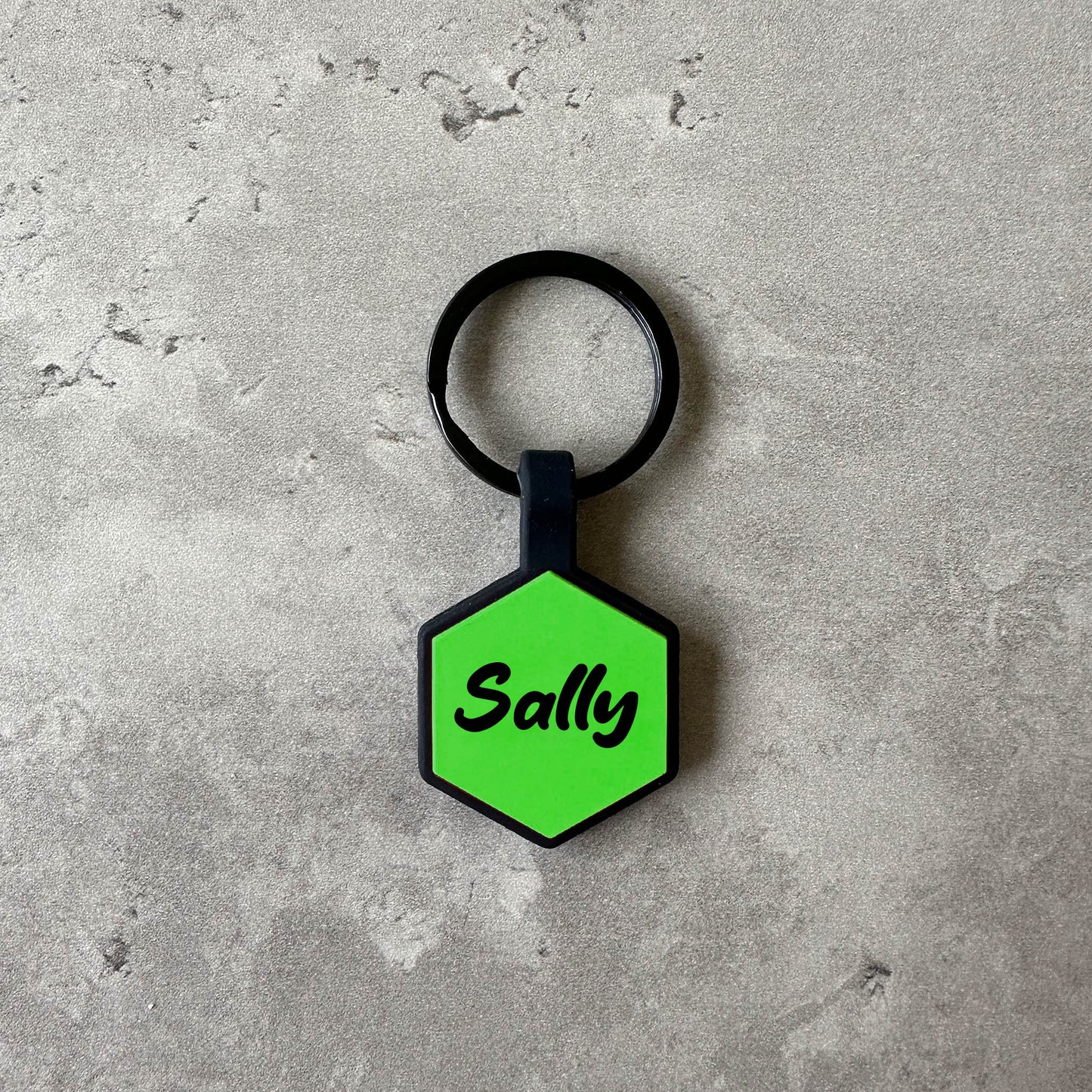 Varje namnbricka är tillverkad av 100% silikon, med en svart nyckelring för att passa vilket halsband som helst. Våra taggar är hållbara, vattentäta, lätta att rengöra och färgbeständiga, vilket innebär att du och din bästa vän kan vara säkra på att denna tagg kommer att hålla genom alla utflykter. Dessutom är den tack vare sitt material helt ljudlös, med andra ord inget plingande.