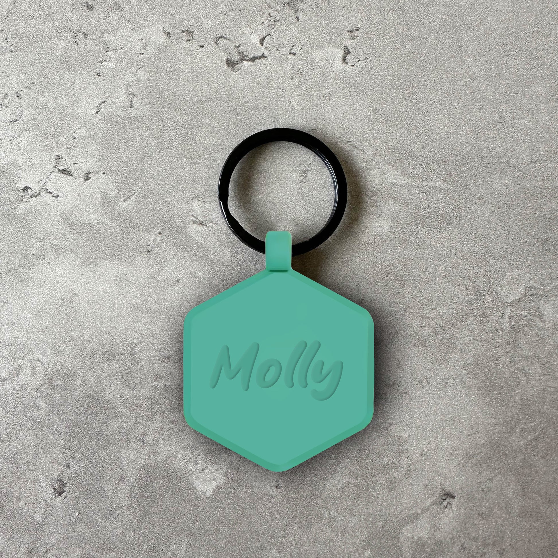 Självlysande silikonbricka av 100% silikon, med en svart nyckelring för att passa vilket hundhalsband som helst. Våra taggar är hållbara, vattentäta, lätta att rengöra och färgbeständiga, vilket innebär att du och din bästa vän kan vara säkra på att denna tagg kommer att hålla genom alla utflykter. Dessutom är den tack vare sitt material helt ljudlös, med andra ord inget plingande.