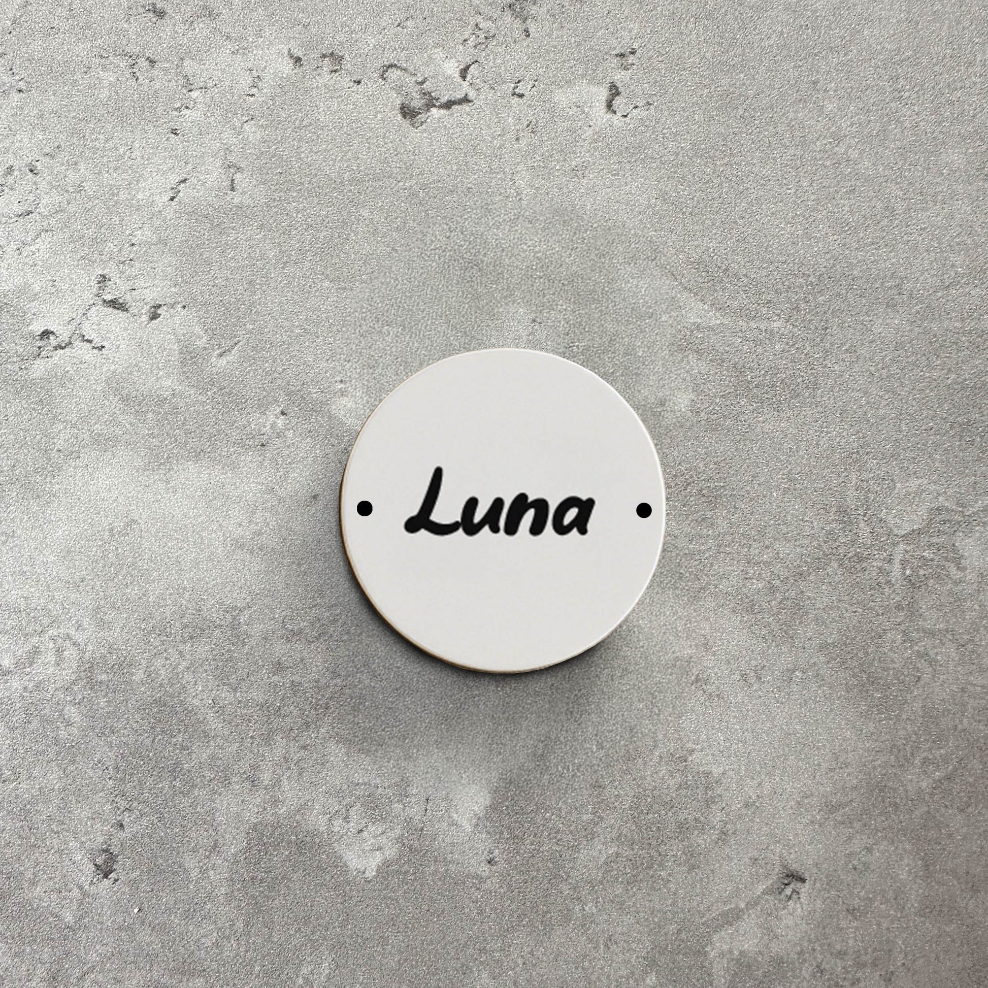 Ge din hall en personlig och stilren touch med vår runda självhäftande namnbricka. Lasergraverad skylt som är perfekt att placera ovanför krokar för koppel, selar eller var du än vill skapa en personlig plats för din fyrbenta vän.