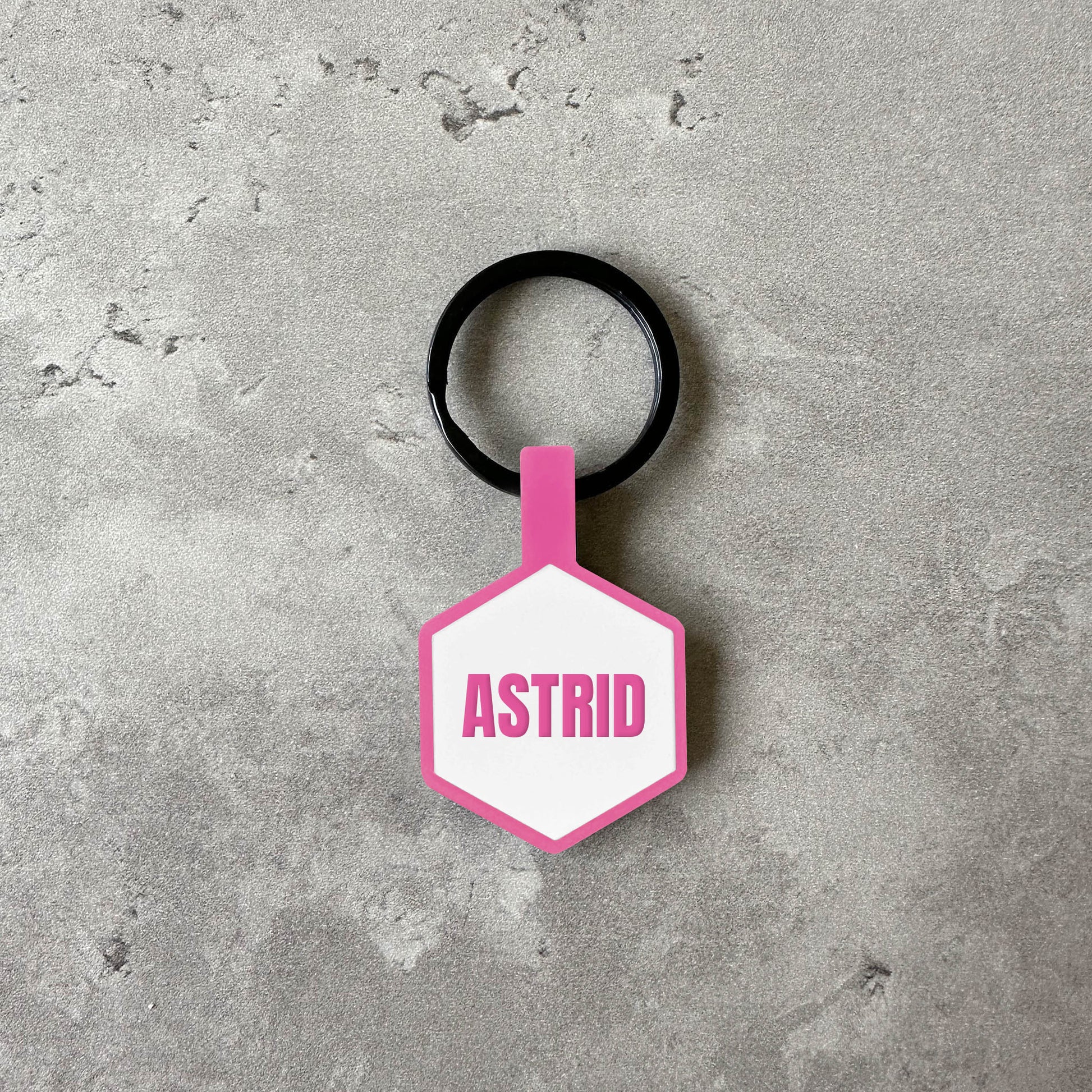 Vit/rosa namnbricka till hund - Typsnitt Anton
