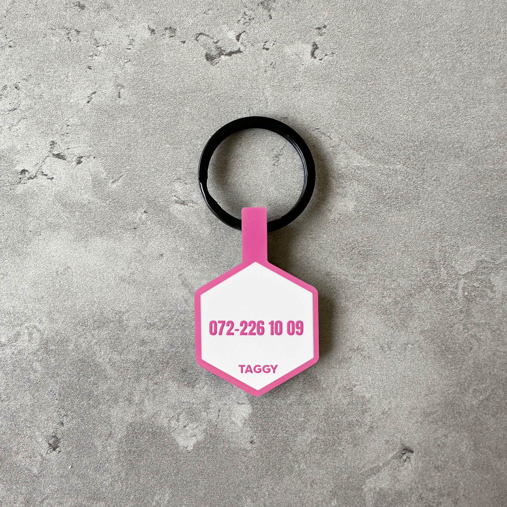 Vit/rosa namnbricka till hund - Typsnitt Tea